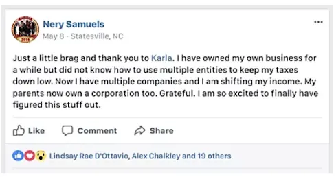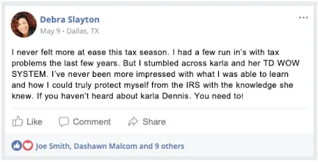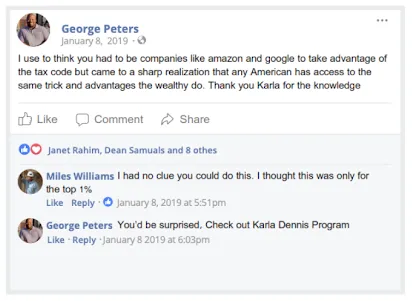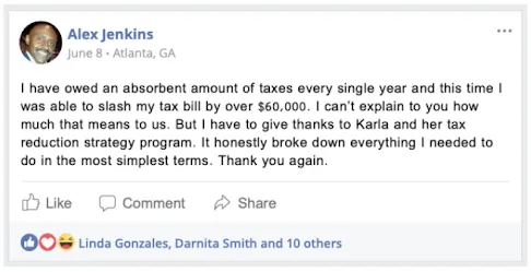 "I found new ways to reduce my taxable footprint and now I don't have to fear the IRS at all anymore, thank you Karla."